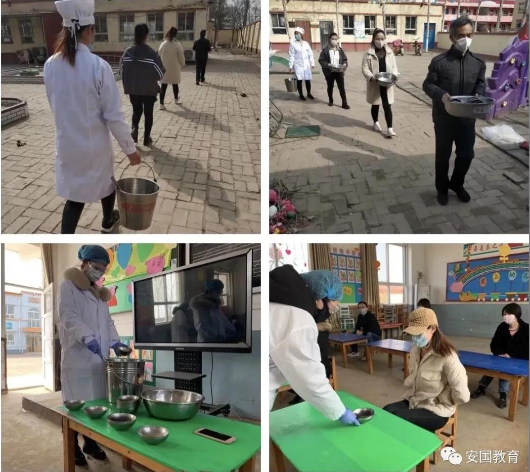在教师送餐,幼儿取餐环节上,分时间段、分班级进行,幼儿取餐时避免发生会面,就餐时做到一幼一桌。